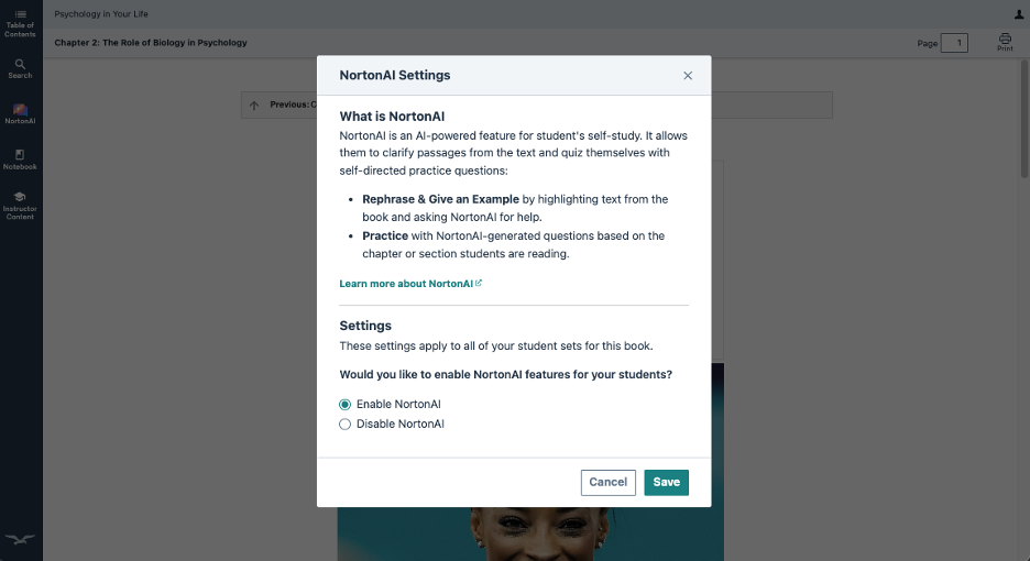 When you open the NortonAI settings, you can turn off the feature for all students in your student sets by selecting “Disable NortonAI.”