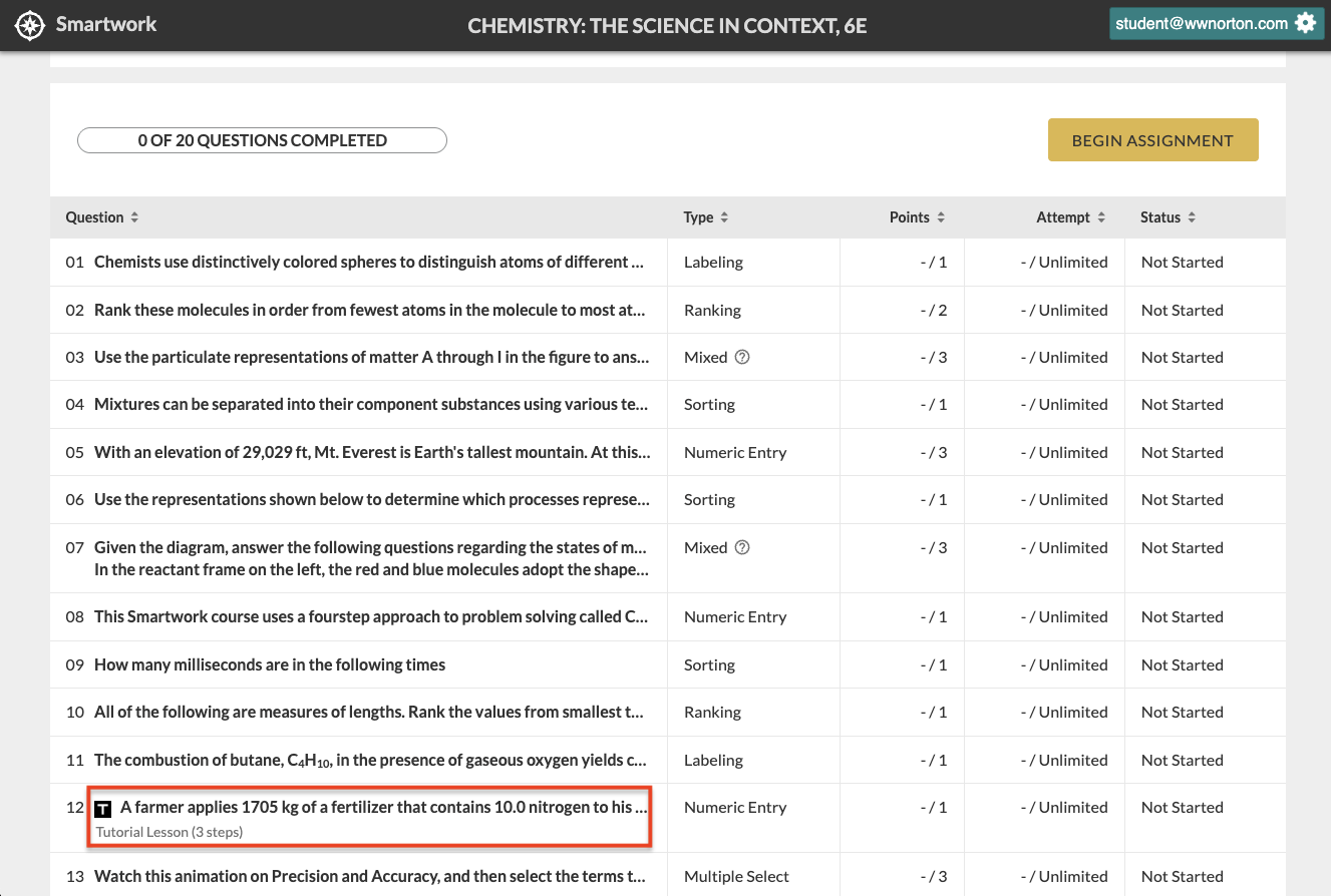 You’ll be able to identify questions with a Tutorial Lesson by looking at the main assignment page, where you’ll see a “T” icon and a dropdown list of the Step questions.