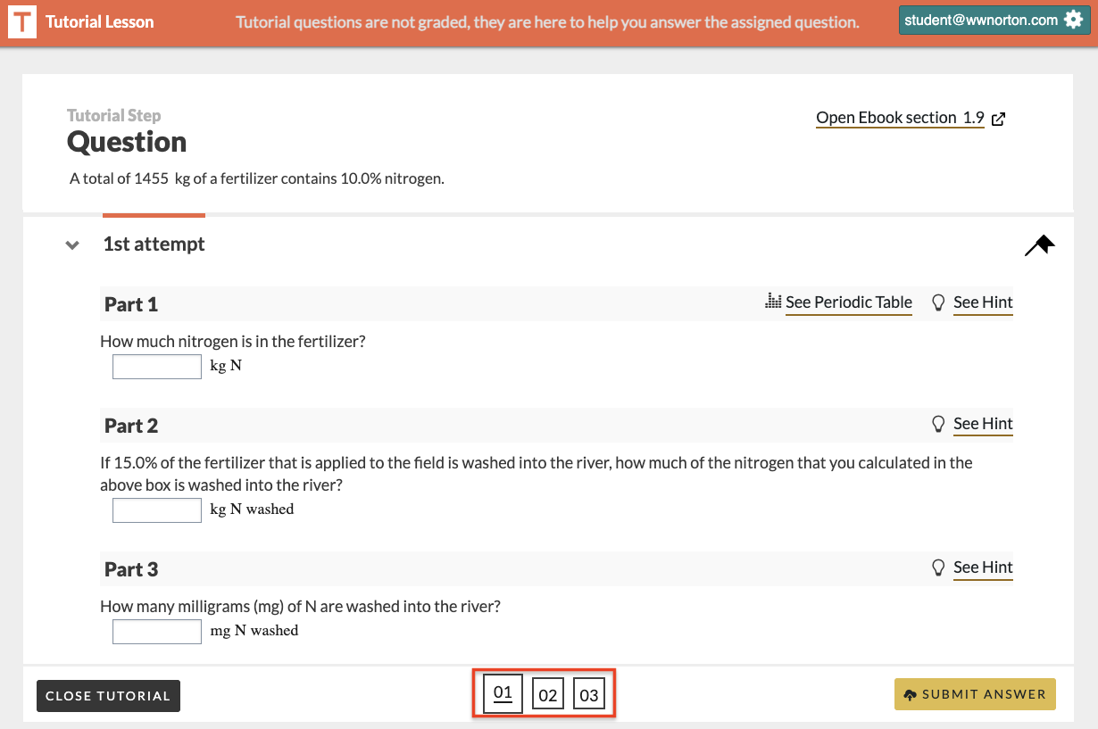 A Tutorial Lesson is a series of questions, consisting of one assigned “Parent” question and multiple, optional “Step” questions. These Step questions are designed to help you figure out the answer to the assigned question by reviewing its main concepts. While the Parent question is graded, the Step questions are not.